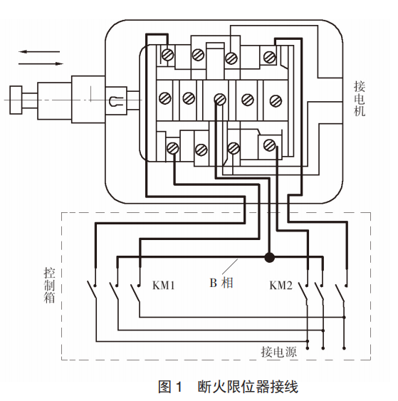 斷火限位器正確接線,共有 5 根線,B 相是公共線,靠近推桿一側(cè)的端子接上升接觸器的 AC 相,另一側(cè)接下降接觸器AC 相線,如果把這位置接反了,當(dāng)上升限位推桿碰觸斷火限位器時,電動葫蘆仍能上升但不能向下,相反當(dāng)下降限位推桿碰觸斷火限位器時,電動葫蘆仍能下降但不能向上(圖 1)。