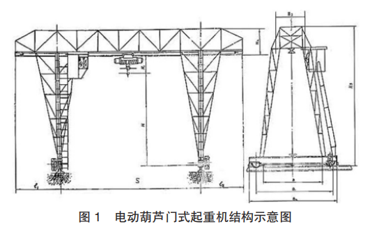 電動葫蘆門式起重機具有場地利用率高、作業(yè)范圍大、適應面廣、通用性強等優(yōu)點;同時因其結構簡單等導致其整體穩(wěn)定性相對較差、起升和運行晃動較大,一旦安全裝置失效極易發(fā)生事故。圖 1 為電動葫蘆門式起重機結構示意圖。