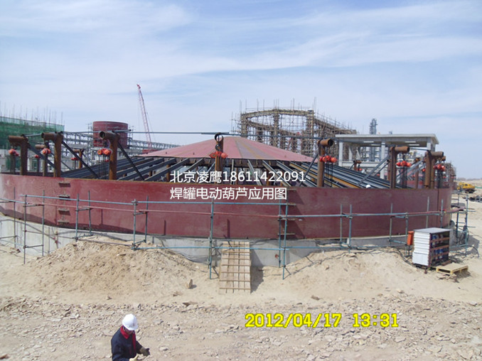 焊罐電動(dòng)葫蘆是用于新建儲(chǔ)油罐群體吊裝施工中,可以大大減輕施工人員的勞動(dòng)強(qiáng)度,提高工作效率。但是由于油罐較大型,并噸位較大,所以起重量的確定是保障安全的前提。