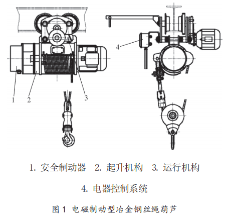 電磁制動或機(jī)械制動屬于安全制動器的范疇,此類冶金電動葫蘆類似于傳統(tǒng)的CD、MD型鋼絲繩電動葫蘆,整機(jī)串聯(lián)結(jié)構(gòu),包含起升機(jī)構(gòu)、運(yùn)行機(jī)構(gòu)和電器控制系統(tǒng)。