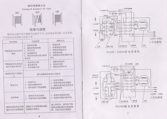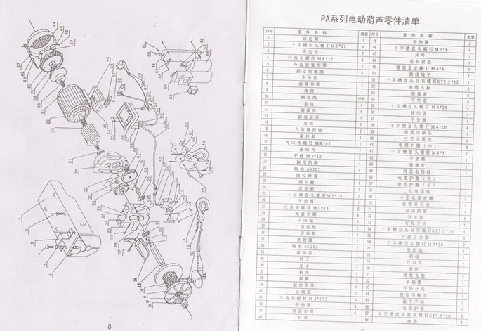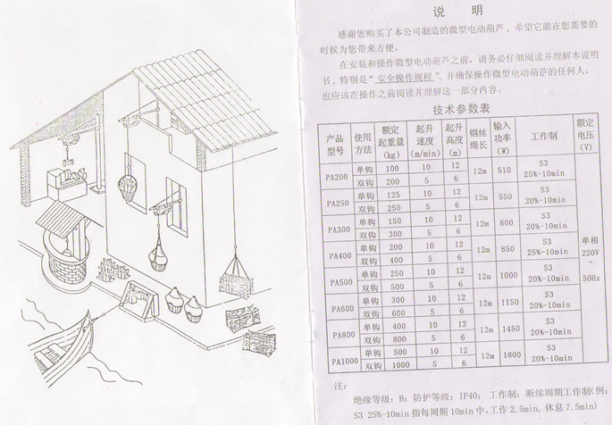 小型電動(dòng)葫蘆的使用手冊(cè),一般包含一些必要的說(shuō)明、技術(shù)參數(shù)表、安全操作規(guī)程、安裝、操作、保養(yǎng)、故障與排除、接線(xiàn)原理、零件清單等內(nèi)容。