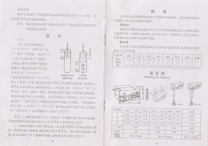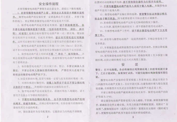 小型電動(dòng)葫蘆又名微型電動(dòng)葫蘆、單相電鋼絲繩電動(dòng)葫蘆,在220v的工作場(chǎng)所使用非常的廣泛。小型電動(dòng)葫蘆的使用手冊(cè)是電動(dòng)葫蘆出廠前包裝或者另外寄送的,所有人員在使用小型電動(dòng)葫蘆之前,都需要仔細(xì)閱讀。