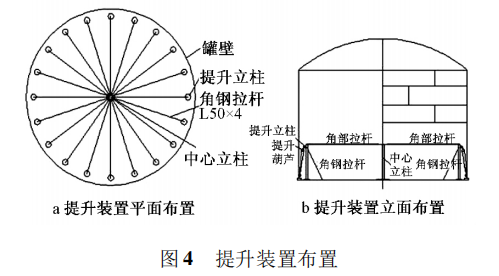 電動葫蘆提升倒裝法的施工裝置主要由電動葫蘆、中心立柱、膨脹圈、斜撐以及調節(jié)裝置等組成,提升裝置如圖4所示。在儲罐內(nèi)部距罐壁500mm左右的同心圓上均布20個10t倒鏈,提升電動葫蘆固定在倒裝立柱上。倒裝立柱用159*8鋼管制成,高3.2m,立柱上端吊耳、底座及筋板均用16mm鋼板制作而成。在立柱3/4高度位置3個方向安裝3根斜撐。斜撐之間的夾角及斜撐與罐底的夾角均以450為宜,罐中心安裝1根中心立柱,用于把每個提升立柱連在一起,形成一個整體。