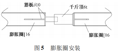 膨脹圈采用16滾弧制成,根據(jù)罐體周長分若干節(jié)制作,本工程分為4等分。膨脹圈安裝時,在膨脹圈4等分位置處用4個16t千斤頂將膨脹圈頂緊,使其緊貼在罐壁上,通過龍門卡具將膨脹圈與罐壁固定成一體,龍門卡具沿著膨脹圈每隔1m設置1個。膨脹圈用千斤頂頂緊的4個位置應避開倒裝立柱。膨脹圈制作成型后的曲率應和管內(nèi)壁的曲率一致,膨脹圈安裝如圖5所示。