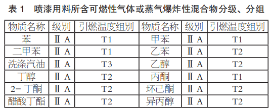 按照《爆炸危險(xiǎn)環(huán)境電力裝置設(shè)計(jì)規(guī)范》(GB 50058-2014)的強(qiáng)制性條文,選擇隔爆型(“d”)結(jié)構(gòu)符合1區(qū)爆炸性危險(xiǎn)區(qū)域的要求,防爆電動(dòng)葫蘆采用了隔爆電動(dòng)機(jī)、隔爆電氣控制柜和隔爆按鈕。噴漆用料所含可燃性氣體或蒸氣爆炸性混合物分級(jí)、分組見(jiàn)表1。