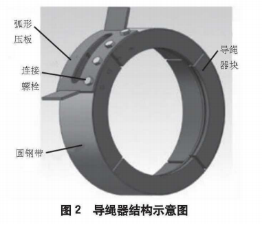 目前常用的圓環(huán)式導(dǎo)繩器套在卷筒外面,由幾段組成一個圓環(huán)(又稱螺母),靠其與卷筒的螺紋副關(guān)系沿卷筒軸向移動,但其本身不能轉(zhuǎn)動,如圖2所示,導(dǎo)繩器塊外周上固定連接一個設(shè)有過繩槽的弧形壓板,整個導(dǎo)繩器由圓鋼帶、弧形壓板等部件組成。當(dāng)電動葫蘆卷筒轉(zhuǎn)動時,導(dǎo)繩器由螺紋槽帶動沿軸向方向移動,同時將所纏繞的鋼絲繩有序的排出或排入螺旋槽。當(dāng)鋼絲繩卷繞與導(dǎo)繩器移動不能同步進(jìn)行時,導(dǎo)繩器的滑動就容易導(dǎo)致其被拉壞折斷。在對導(dǎo)繩器進(jìn)行設(shè)計時由于沒有對其所受橫向拉力的強(qiáng)度有所要求,因此斜拉歪吊能夠直接拉裂導(dǎo)繩器。在歪拉斜吊這種誤操作下導(dǎo)繩器極易損壞,而正常操作下它也是壽命不長的易 損裝置 。