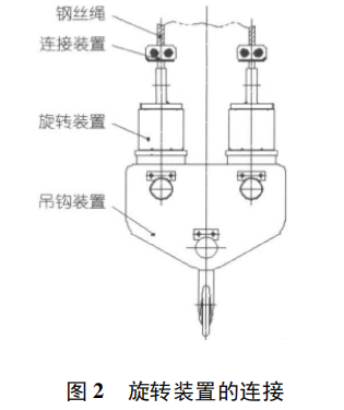 為了降低生產成本和減少非標零部件的數量,在保持原有電動葫蘆結構不變的基礎上,將旋轉裝置上連接軸與葫蘆鋼絲繩通過連接件固定在一起,下連接軸與吊鉤通過銷軸進行鉸接,見圖2。