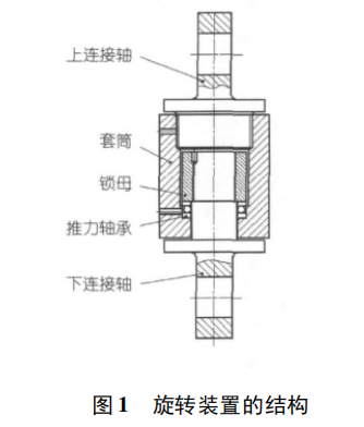 鋼絲繩旋轉(zhuǎn)裝置的結(jié)構(gòu)見(jiàn)圖1,上連接軸1與套筒2通過(guò)螺紋連接,并用銷(xiāo)釘鎖死形成一體,與此類(lèi)似下連接軸5穿入套筒內(nèi)后,與套筒內(nèi)的鎖母3旋合并鎖死,這樣裝置就分為上下兩部分,這兩部分通過(guò)中間的推力軸承4連接起來(lái)。該裝置大的特點(diǎn)在于,由于有推力軸承存在,上下兩部分可以獨(dú)立地轉(zhuǎn)動(dòng),即在上連接軸發(fā)生旋轉(zhuǎn)時(shí),下連接軸保持不動(dòng),這正滿足了解決鋼絲繩“打麻花”問(wèn)題的要求。