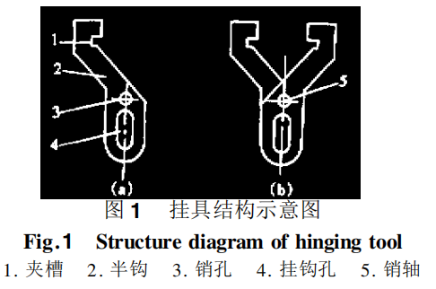 如圖1所示,掛具的主體部分是1個尺寸形狀完全相同的部件,這里稱之為半鉤。半鉤上有夾槽、銷孔和掛鉤孔,如圖1(a)所示,夾槽用來夾持工字鋼頂梁或鉸接頂梁的下緣,銷孔中穿入銷軸將半鉤組裝成掛具,如圖1(b)所示。2個半鉤繞銷軸轉(zhuǎn)動可改變2個夾槽之間的距離,實現(xiàn)摘下和按上掛具的動作。掛鉤孔中插入手拉葫蘆的掛鉤,手拉葫蘆的掛鉤起到固定銷的作用,限制2個半鉤開合,實現(xiàn)掛具夾持牢固。