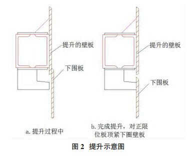 正后將圍板合口收緊并焊接壁縫,下移提升梁,完成一個提升循環(huán),提升施工見圖2所示。