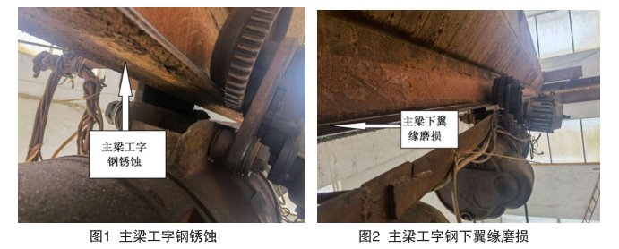 (一)主梁工字鋼表面銹蝕嚴重,下翼緣上表面磨損嚴重,并形成了一定深度的坑槽,如圖1、圖2所示;