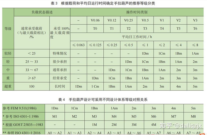 表 4 中 對(duì)于手拉葫蘆而言,目前很多國(guó)際機(jī)構(gòu)和專業(yè)制造商仍然采用舊版與 FEM 9.511 相關(guān)對(duì)應(yīng),認(rèn)為這些使用狀態(tài)等級(jí)還比較適用。 基于目前的常見(jiàn)標(biāo)準(zhǔn)制式的手拉葫蘆正常使用情況下的相關(guān)對(duì)照。對(duì)于其他情況的換算,參考新版 ISO 4301-1:2016 附錄 B 機(jī)構(gòu)工作級(jí)別的換算指南給出,舊版本中機(jī)構(gòu)工作級(jí)別M(對(duì)應(yīng)滿載循環(huán)的總工作時(shí)間)和新版中工作級(jí)別 A(對(duì)應(yīng)設(shè)計(jì)的滿載工作循環(huán)次數(shù))換算方法和示例。此標(biāo)準(zhǔn)對(duì)手拉葫蘆朝著更先進(jìn)、精細(xì)化、輕量化和定制化等的發(fā)展有著重要的指導(dǎo)和實(shí)踐意義。