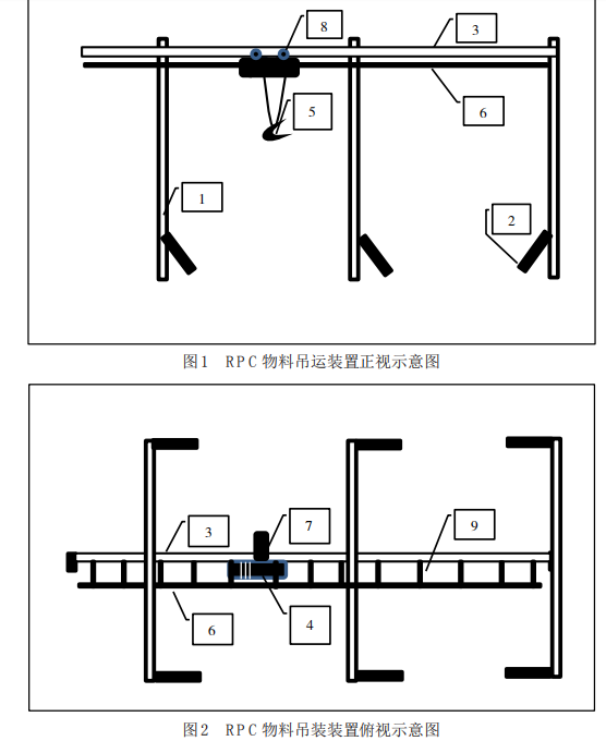 物料吊運裝置設(shè)計結(jié)構(gòu)示意圖,如圖 1 和圖 2所示。圖中:1—基礎(chǔ)支架;2—支架斜支撐;3—運行軌道;4—電動葫蘆;5—物料吊鉤;6—電路滑線;7—移動電機;8—移動滾輪;9—滑線支架。