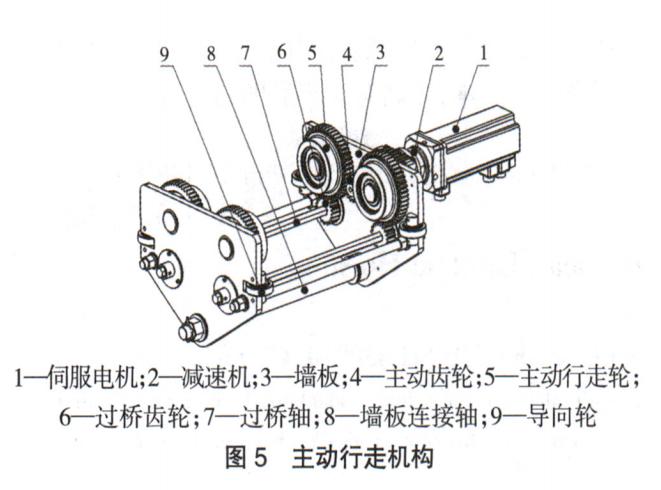 墻板是電動葫蘆行走機構(gòu)的主要結(jié)構(gòu)件,與過橋軸、墻板連接軸一起組成行走機構(gòu)的結(jié)構(gòu)框架。墻板分為左右兩塊,右側(cè)墻板固定有減速機,減速機一端固定有伺服電機,另一端固定有主動齒輪。主動齒輪與兩個固定在右側(cè)墻板上的主動行走輪嚙合,主動行走輪與固定在右側(cè)墻板上的過橋齒輪嚙合,過橋齒輪連接過橋軸,驅(qū)動固定在左側(cè)墻板上的過橋齒輪,進而驅(qū)動固定在左側(cè)墻板上的主動行走輪,實現(xiàn)電動葫蘆行走機構(gòu)四個主動行走輪的同步運行。