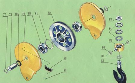 北京凌鷹電動(dòng)葫蘆吊鉤部件有兩種形式:(1)一只滑輪的單輪式,適用于纏繞鋼絲繩為兩支(2/1出繩)的起升機(jī)構(gòu)上;兩只滑輪的雙滑式,適用于纏繞鋼絲繩為四支(4/2或4/1出繩)的起升機(jī)構(gòu)上。吊鉤組:符合起重吊鉤GB/T1005.1~5-98標(biāo)準(zhǔn),材質(zhì)為DG20,安全系數(shù)大于5;吊鉤表面光潔無裂紋、折疊、過燒等缺陷;內(nèi)部無裂紋、白點(diǎn)和其他影響使用安全的夾雜物等其他缺陷。吊鉤帶有防止鋼絲繩脫鉤的防脫鉤裝置。確保吊鉤在使用過程中的安全可靠性。