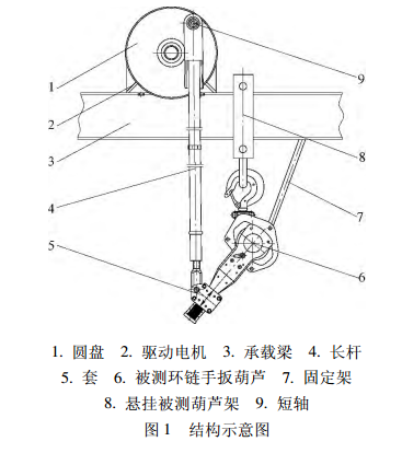 環(huán)鏈?zhǔn)职夂J需要懸掛在規(guī)定工位上,將驅(qū)動(dòng)裝置的電機(jī)以一定角度和一定距離固定在懸掛環(huán)鏈?zhǔn)职夂J的承載梁上, 角度要求電機(jī)輸出軸與環(huán)鏈手扳葫蘆的操作手柄相垂直, 距離要求安裝完驅(qū)動(dòng)裝置后不發(fā)生干涉。在固定好驅(qū)動(dòng)電機(jī)后,在電機(jī)輸出軸上安裝一個(gè)周邊焊有小短軸的圓盤,在小短軸上通過關(guān)節(jié)軸承連接一根長桿(長桿可分為幾段,相互通過螺紋扣連接,方便調(diào)節(jié)距離,關(guān)節(jié)軸承可以調(diào)整角度),在長桿的另一端通過螺紋扣連接一個(gè)套 (套可以靈活轉(zhuǎn)動(dòng)) ,通過該套與環(huán)鏈?zhǔn)职夂J的操作手柄進(jìn)行連接,見圖1進(jìn)行試驗(yàn)時(shí),首先接通電源,電機(jī)帶動(dòng)安裝在輸出軸上的圓盤做圓周運(yùn)動(dòng),圓盤上的短軸帶動(dòng)長桿以電機(jī)輸出軸為中心進(jìn)行上下擺動(dòng),這樣,環(huán)鏈?zhǔn)职夂J的手柄在長桿上連接套的帶動(dòng)下一起上下擺動(dòng),從而實(shí)現(xiàn)重物上升、下降的動(dòng)作。為了避免在進(jìn)行試驗(yàn)時(shí)環(huán)鏈?zhǔn)职夂J的轉(zhuǎn)動(dòng),可以在承載環(huán)鏈?zhǔn)职夂J的梁上焊接一固定支架,通過支架將環(huán)鏈?zhǔn)职夂J的相對(duì)位置固定好, 從而實(shí)現(xiàn)更好,更有效的操作。