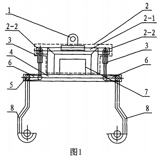 這種吊索具由吊環(huán)(1)、框架體(2)、兩個(gè)液壓油缸(3)、兩個(gè)橫梁(4)、兩個(gè)吊鉤軸(5)、兩個(gè)連動(dòng)梁(6)、液壓泵(7)和四個(gè)吊鉤(8)組成,其特征在于:所述吊環(huán)(1)的下端面固接在框架體(2)的上端面上,所述兩個(gè)橫梁(4)水平設(shè)置在框架體(2)的下方,所述所述兩個(gè)橫梁(4)水平設(shè)置在框架體(2)下端面上,所述兩個(gè)液壓油軸缸(3)的缸體分別固接在框架體(2)的兩側(cè),所述兩個(gè)液壓油缸(3)的連桿下端分別與連動(dòng)梁(6)的一端連接,所述兩個(gè)吊鉤軸(5)與兩個(gè)橫梁(4)構(gòu)成四框體,所述兩個(gè)橫梁(4)的兩端分別與吊鉤軸(5)轉(zhuǎn)動(dòng)連接,所述兩個(gè)吊鉤軸(5)的中部分別與連動(dòng)梁(6)的另一端連接,每個(gè)吊鉤軸(5)的兩端分別固接有吊鉤(8),所述液壓泵(7)位于框架體系(2)內(nèi)并與框架體(2)固接,所述兩個(gè)液壓軸(3)通過油管分別與液壓泵(7)連通。