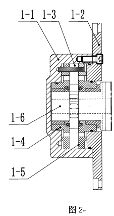 (2)如圖2所示,其中:非圓輪系液壓馬達(dá)1主要由殼體1-1、前端蓋1-2、非圓輪齒輪組1-3、上配流盤1-4、下配流盤1-5、軸1-6組成,該部分的主要功能是將壓力水、壓力油等液壓源的液壓能轉(zhuǎn)換成旋轉(zhuǎn)的機(jī)械能驅(qū)動(dòng)手拉葫蘆進(jìn)行工作。如圖5所示,所述非圓輪齒輪組由外齒圈1-3-1、轉(zhuǎn)子1-3-2及滾輪1-3-3組成,所述滾輪1-3-3設(shè)在內(nèi)部,轉(zhuǎn)子1-3-2設(shè)在滾輪1-3-3和外齒圈1-3-1中間,通過轉(zhuǎn)子1-3-2帶動(dòng)滾輪1-3-3和外齒圈1-3-1轉(zhuǎn)動(dòng)。