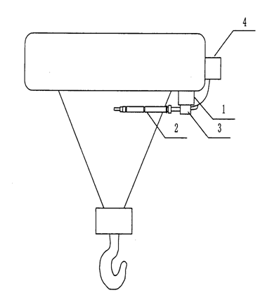 電動葫蘆限位報警裝置,包括安裝在電動葫蘆上的限位檢測裝置1,所述電動葫蘆上位于所述限位檢測裝置1的下方設(shè)有報警檢測裝置2,所述報警檢測裝置2通過報警啟動開關(guān)3連接有報警裝置4,所述報警裝置4為聲音報警裝置或燈光報警裝置,所述報警檢測裝置2為與所述報警啟動開關(guān)連接的開關(guān)探針。