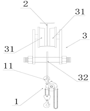 移動(dòng)式手拉葫蘆更能很好的完成操作任務(wù),可以實(shí)現(xiàn)上下左右行走,使操作更加方便。下圖為移動(dòng)式手拉葫蘆實(shí)現(xiàn)結(jié)構(gòu)圖,其中1為手拉葫蘆,2為工字鋼,3為滑行小車,11為手拉葫蘆的上吊鉤,31為滾輪,32為安裝支架。