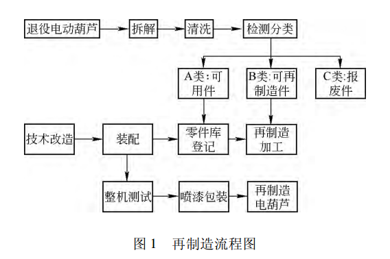 電動(dòng)葫蘆的再制造主要步驟包括回收和初步檢查、拆解、清洗、檢查分類、再制造加工、在裝配以及整機(jī)測(cè)試,其流程如圖1所示。